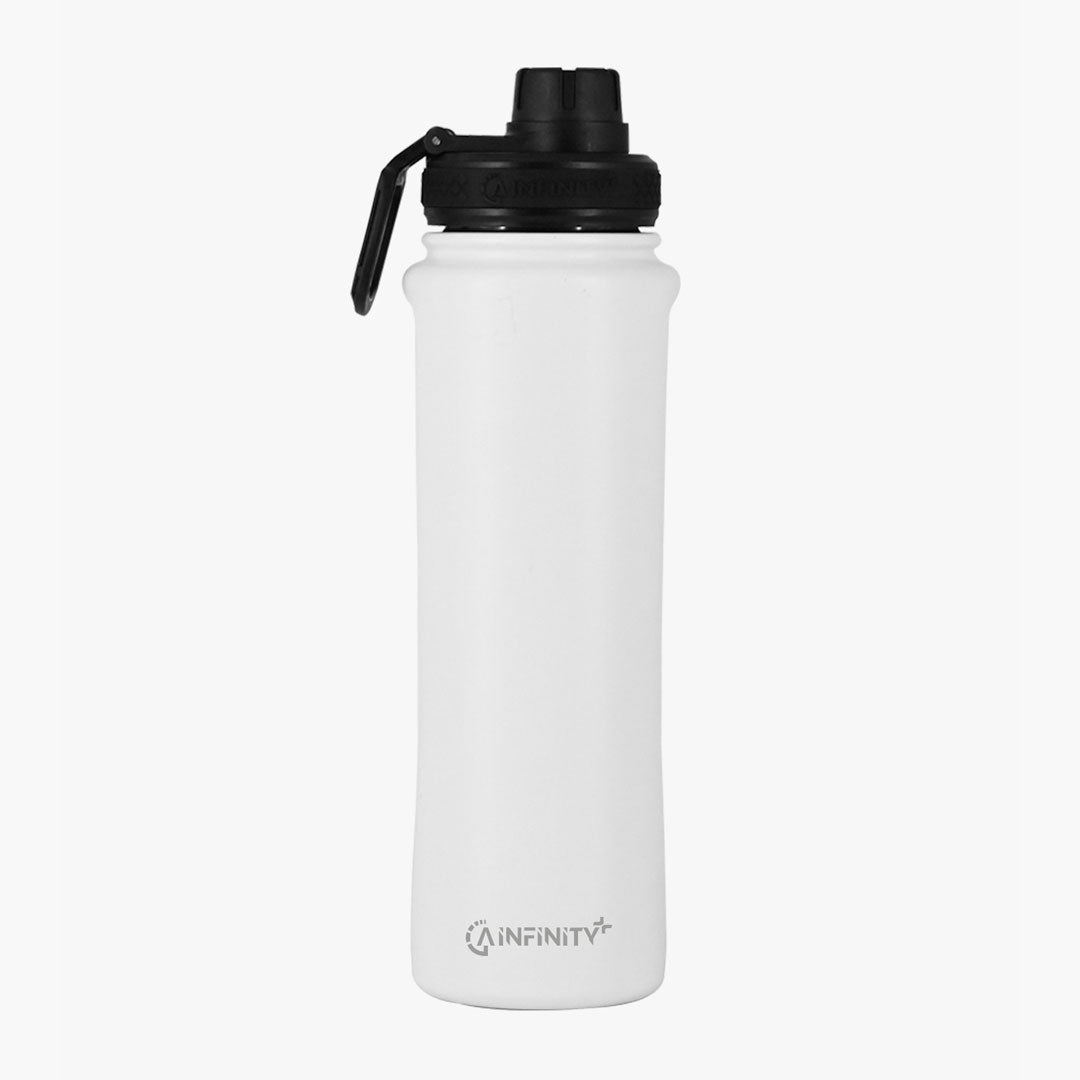 Die doppelwandige Infinity+ Flasche kann kalte Flüssigkeiten bis zu 24 Stunden kalt halten und heiße Flüssigkeiten mit dem Thermoverschluss bis zu 12 Stunden heiß halten.